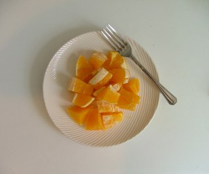 It’s winter and oranges are cheap and sweet. Take out the cutting board and a sharp knife. Slice off each end of the orange. Cut lines into the skin all the way round. Peel off each of the sections. Cut the orange into 2cm cubes. Eat with fingers or a fork.