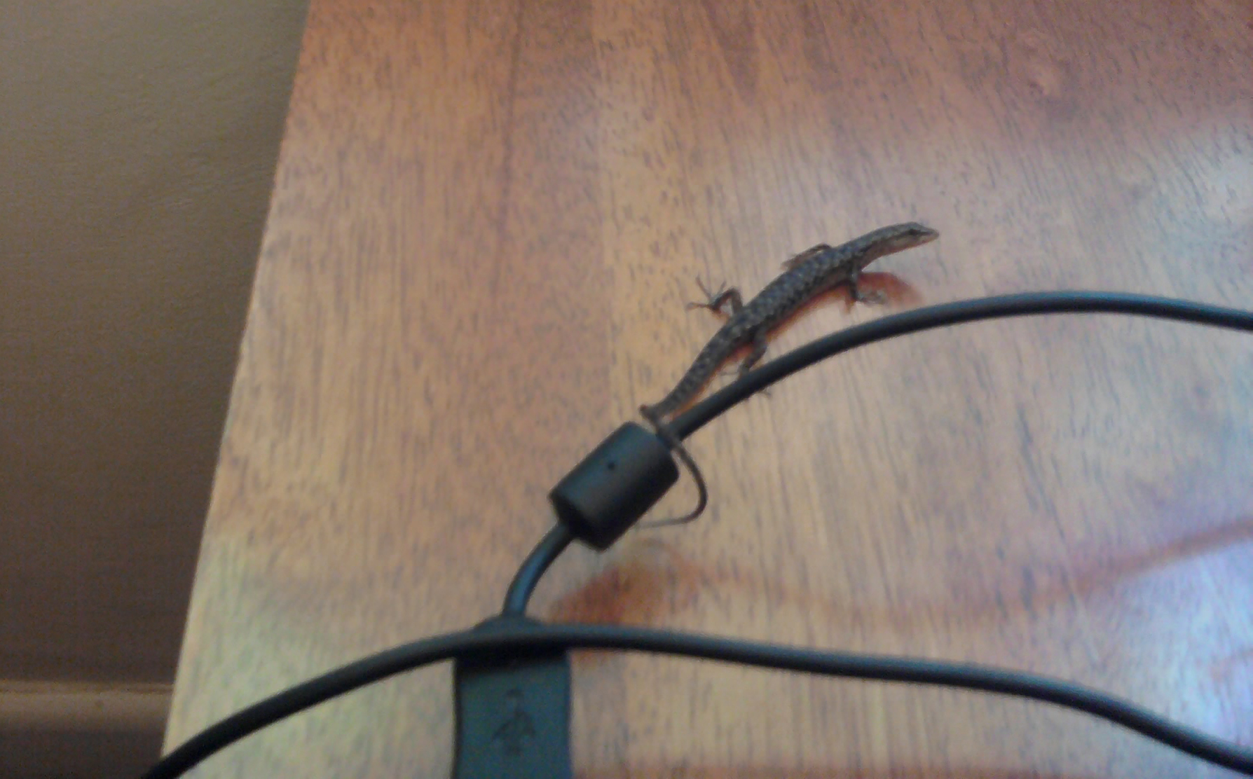While watching Roger, my hands had paused over the keyboard. On the edge of my left hand I felt a light touch, almost a nibble. Was something nibbling my hand!?! I looked down. A good size gecko stared sideways at me. The wild life was no longer just outside.
