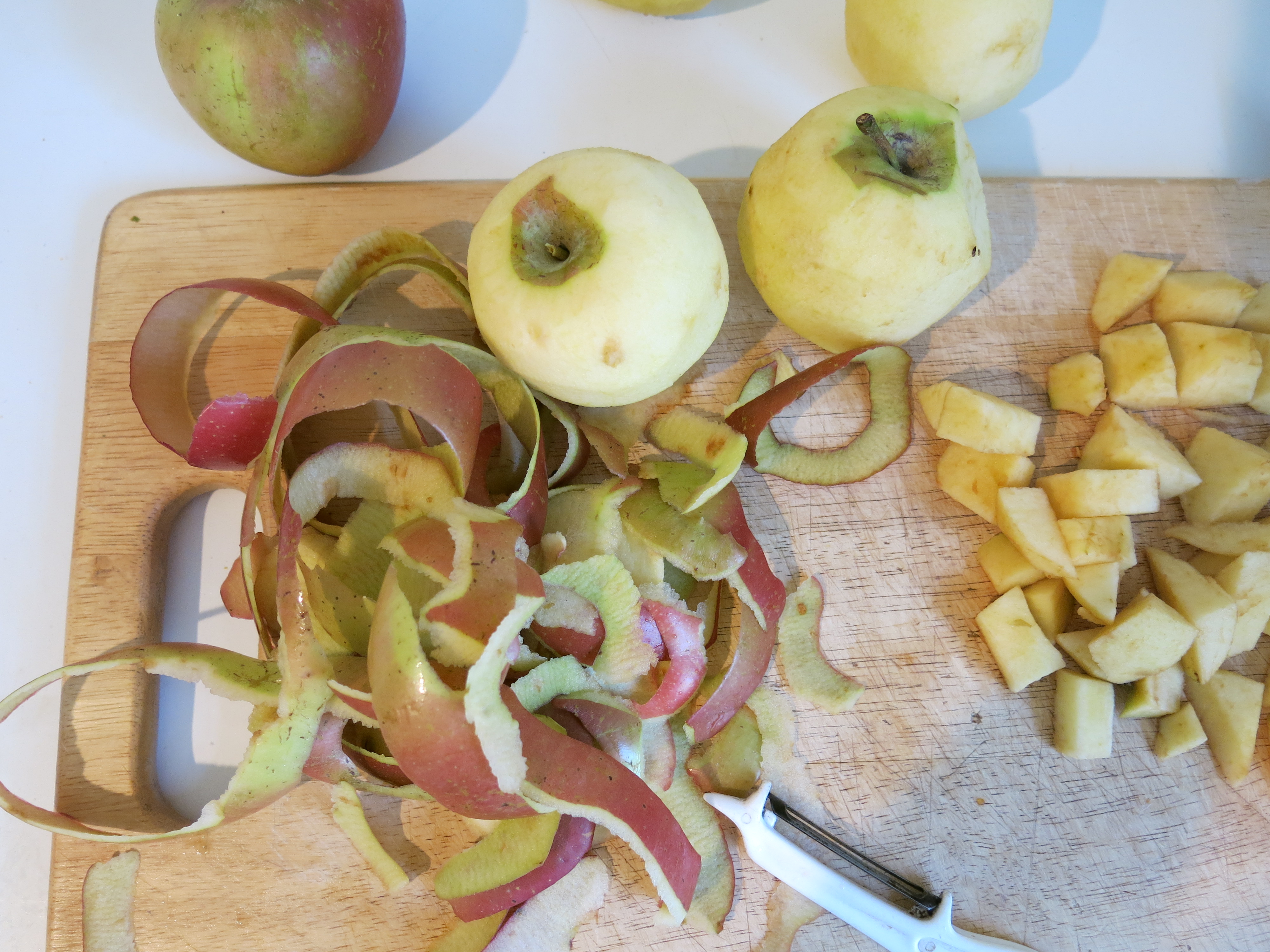 The question was how to bake a cake without eggs. I turned to google. My instinct was correct. Recipes for eggless cake filled several pages. After a little reading I distilled that using oil, baking powder and water would do the trick. I happened to have all of those things. So I set about peeling and chopping the apples. After eating several of them I had a lovely pile of peeled chopped apples.