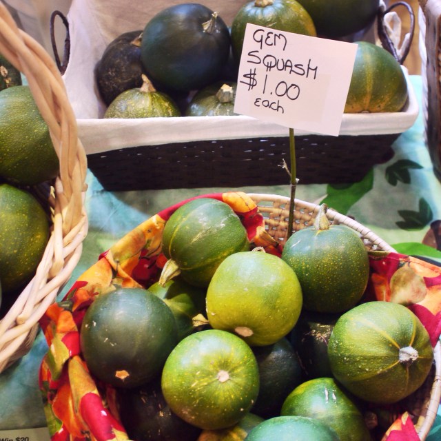 I’ve lived in Australia for all this time without so much as seeing a single gem squash. And then the other day while in a fruit shop I spotted a pile of little green canon balls and knew them immediately. The last time I’d eaten these little vegetables I was seven years old.  I was so excited to see them again that I bought three of them which I immediately regretted because not only did they look like little cannon balls, they were each about as heavy as one.  But I managed to carry them home without herniating the discs in my spine.